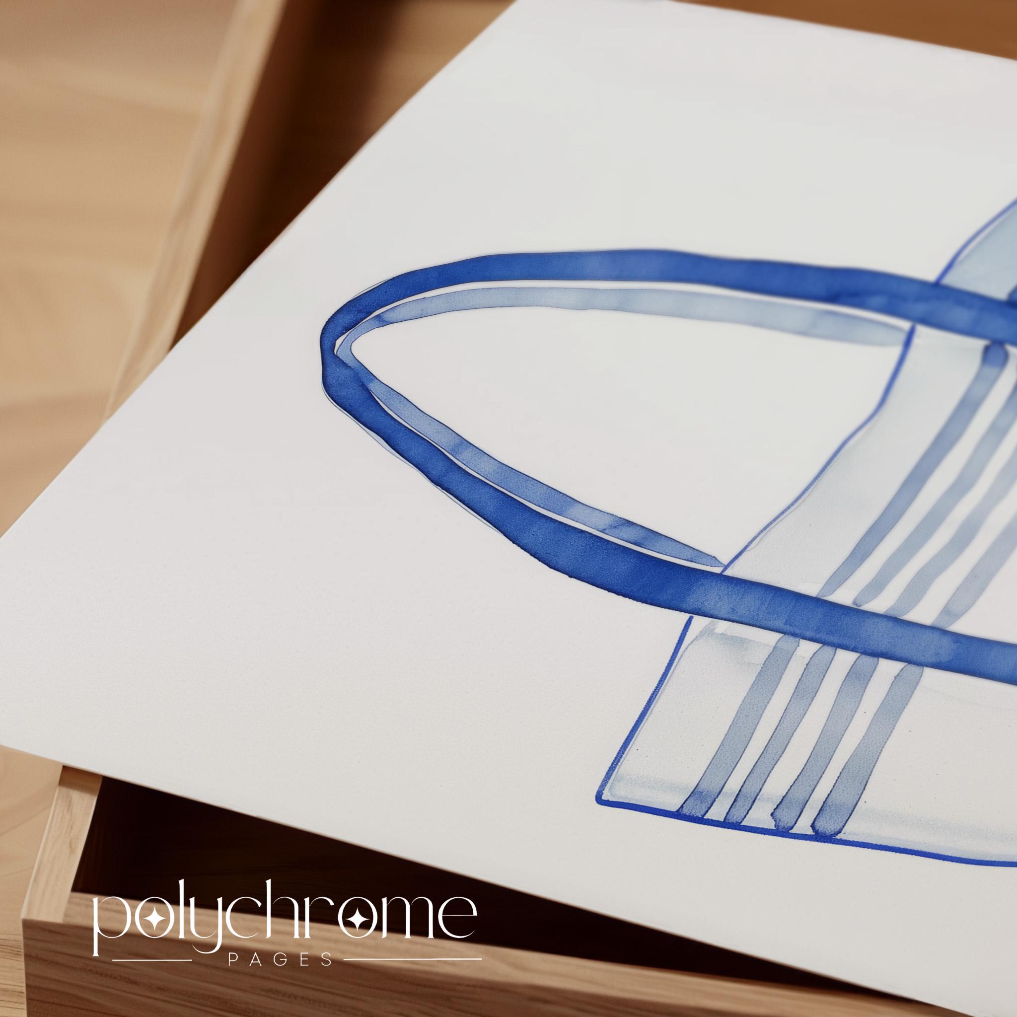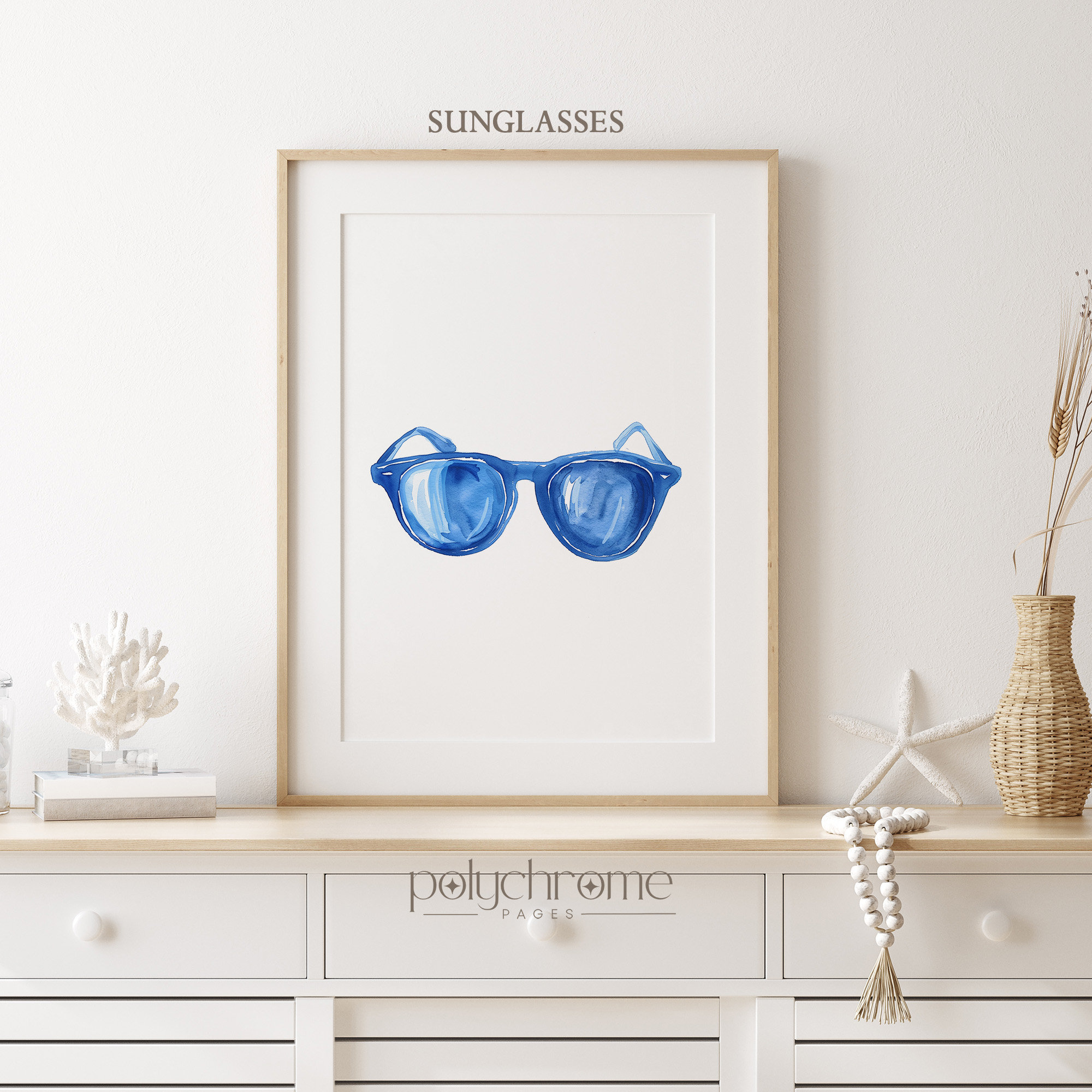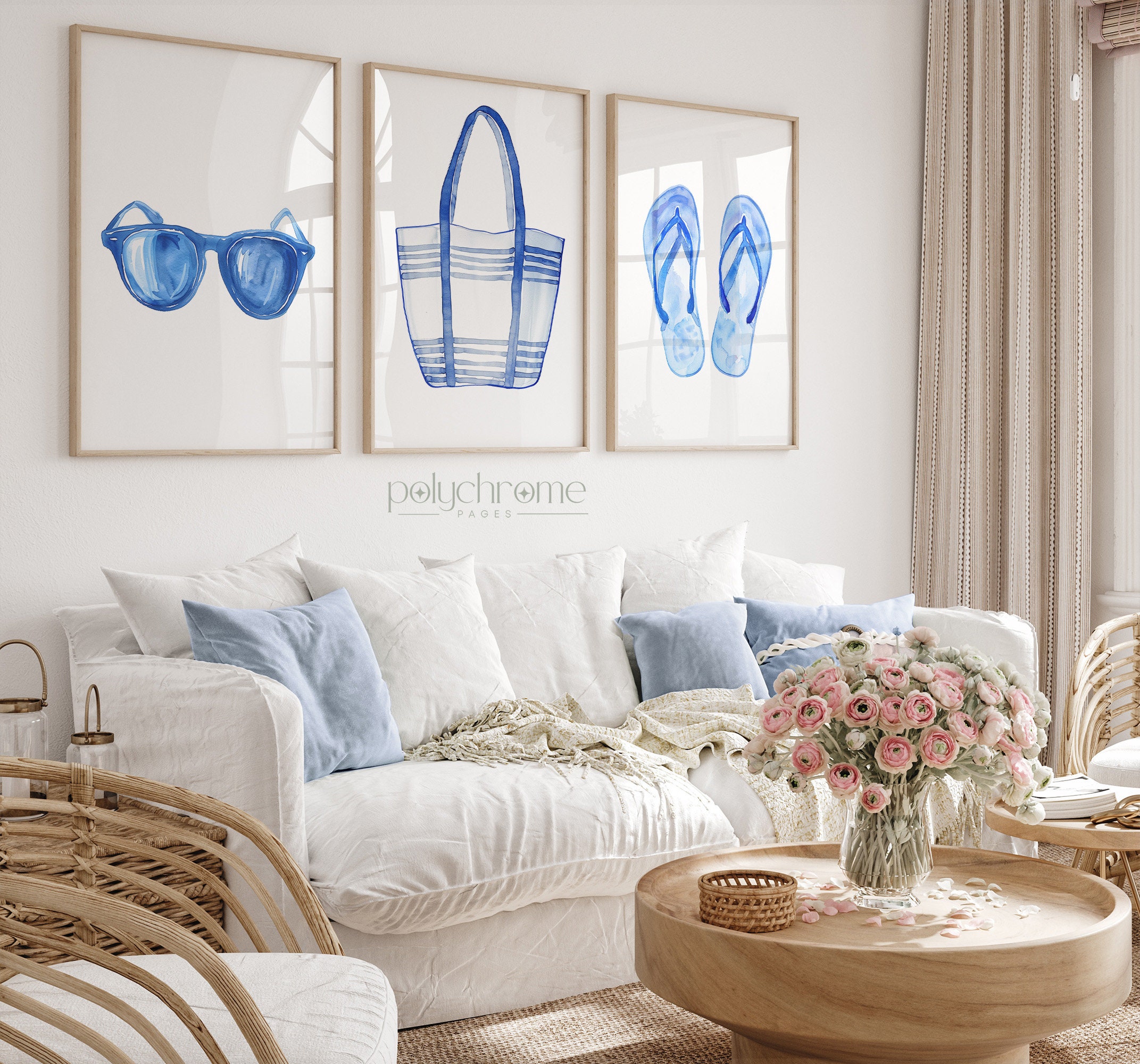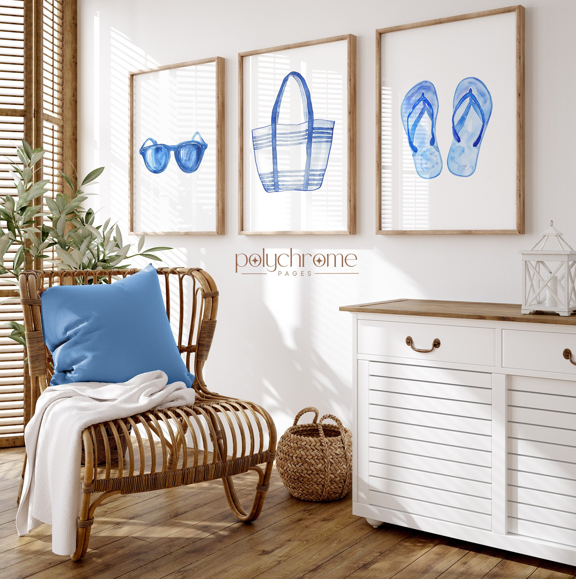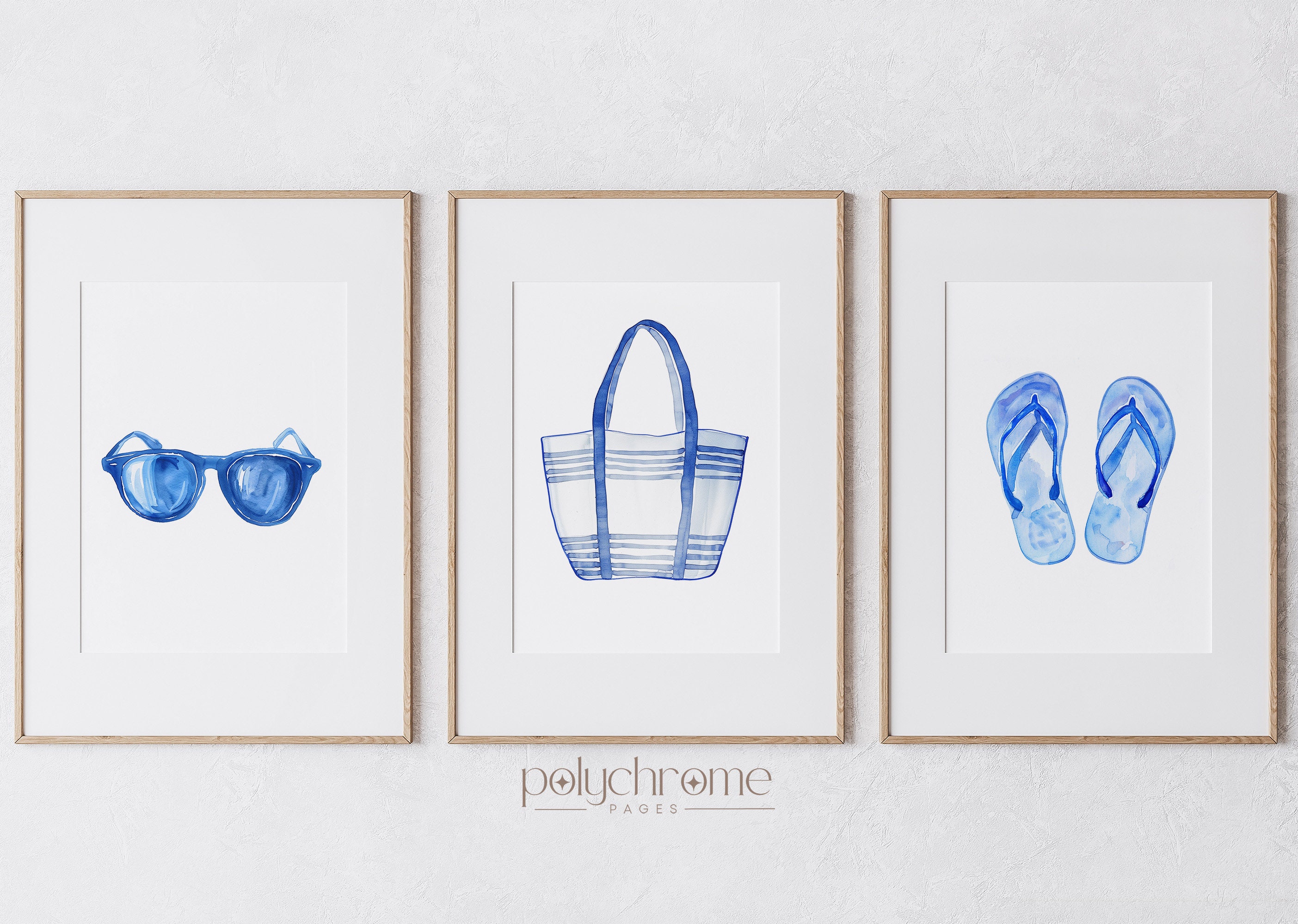 A cheerful blue watercolor featuring classic summer essentials—sunglasses, a woven beach bag, and flip flops—all rendered in soft, breezy tones. This piece captures that easy, sun-soaked feeling and works beautifully in a pool bathroom, beach house entryway, or lakeside cabin. A lovely choice for anyone who loves laid-back coastal style with a fresh, modern twist.