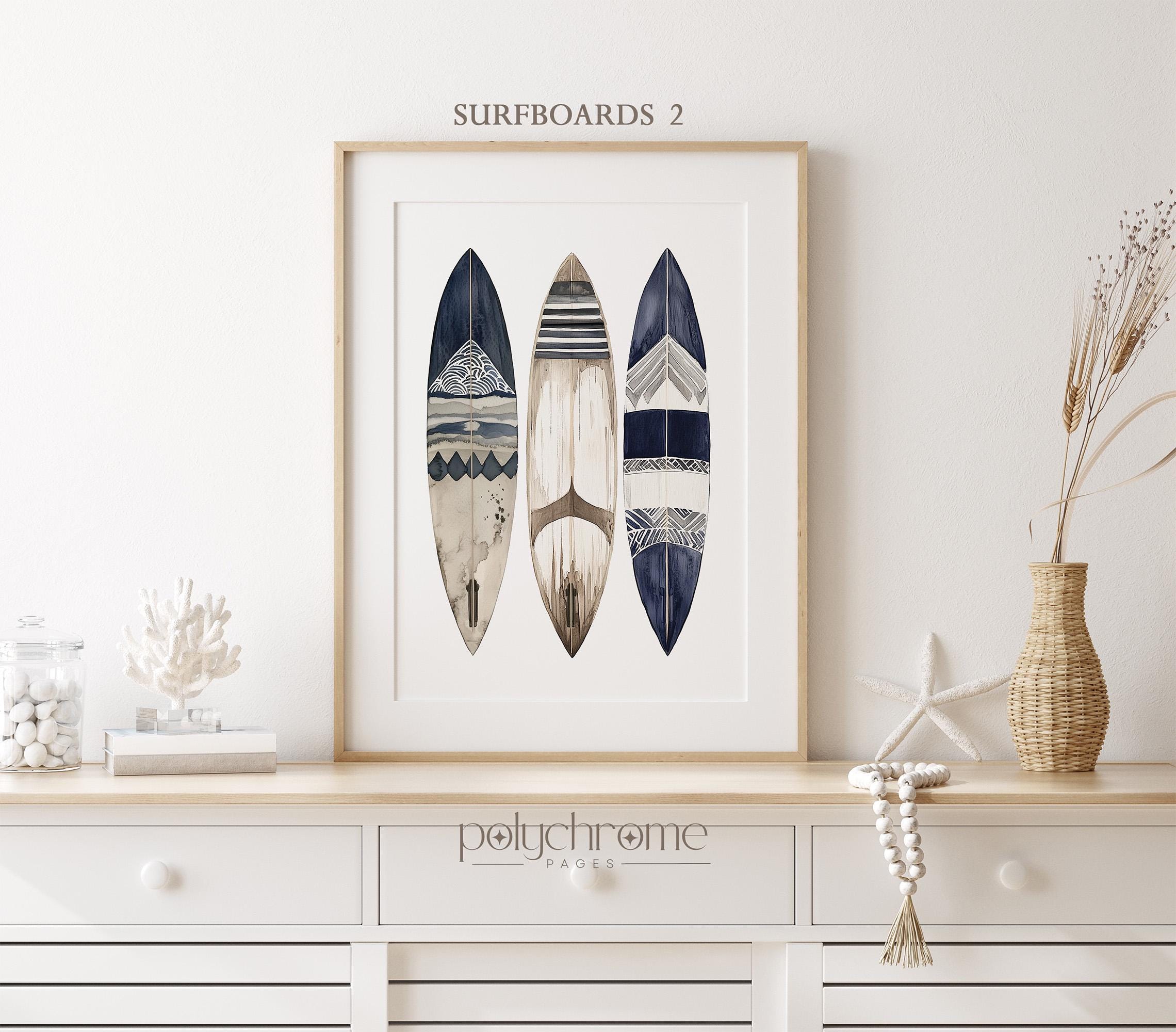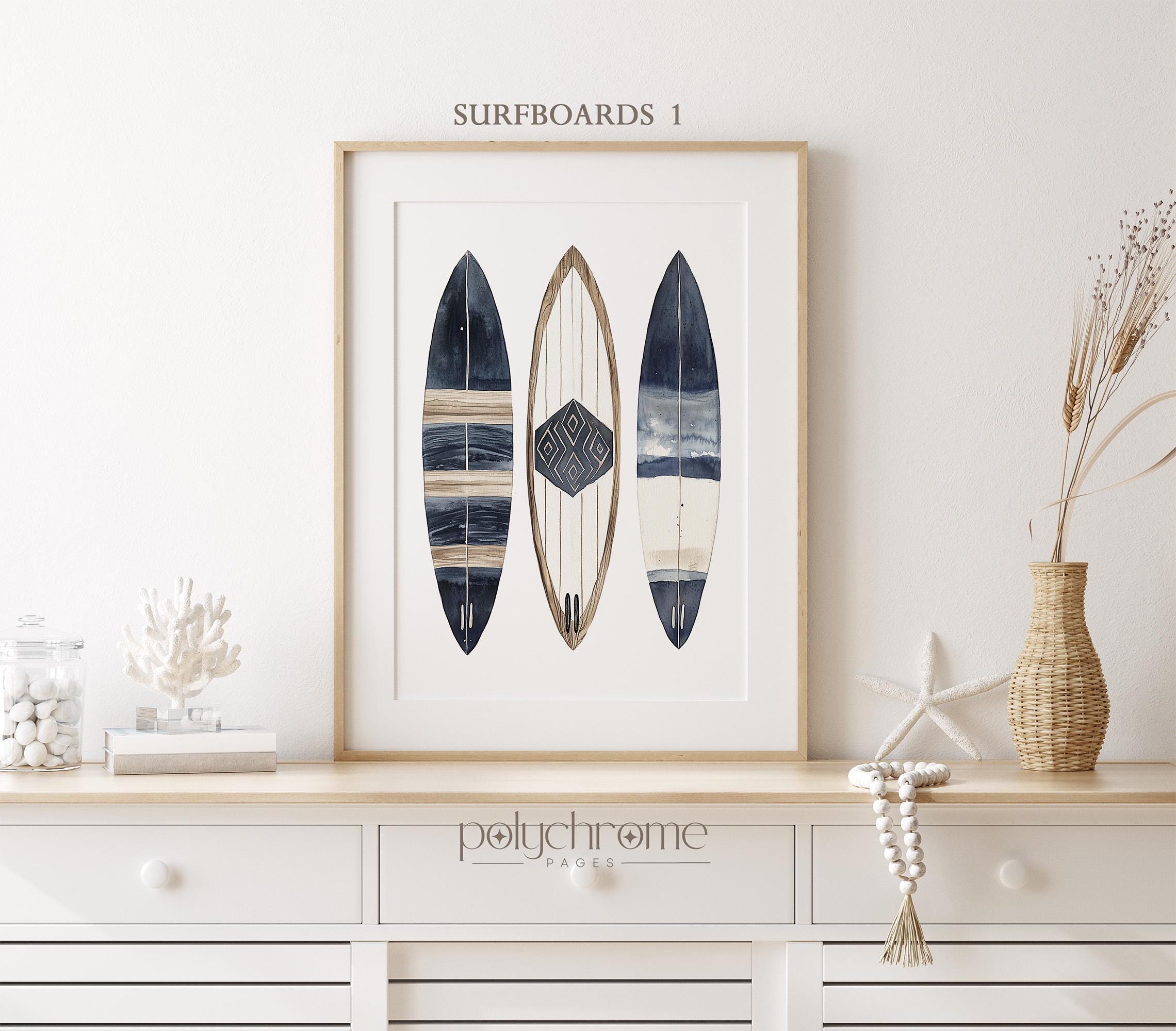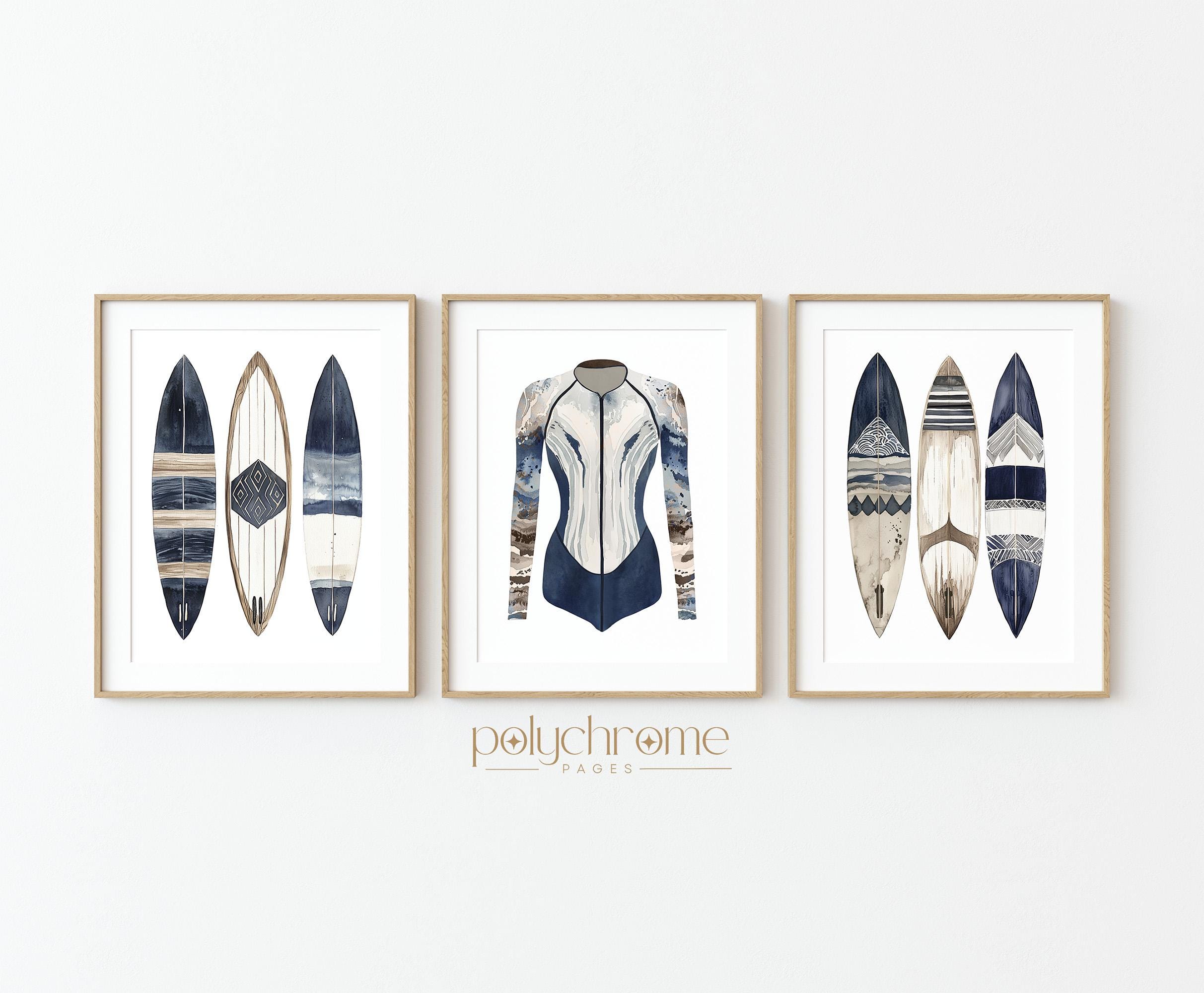 These navy blue and brown watercolor artworks of stand-up paddleboards, surfboards, and a wetsuit—captures the laid-back energy of days spent on the water. The earthy tones and coastal subject matter make them a natural fit for beach house bathrooms, lake house mudrooms, or any space with a Cape Cod feel. A great choice for surfers, paddleboarders, or anyone who loves that relaxed harbor town aesthetic.