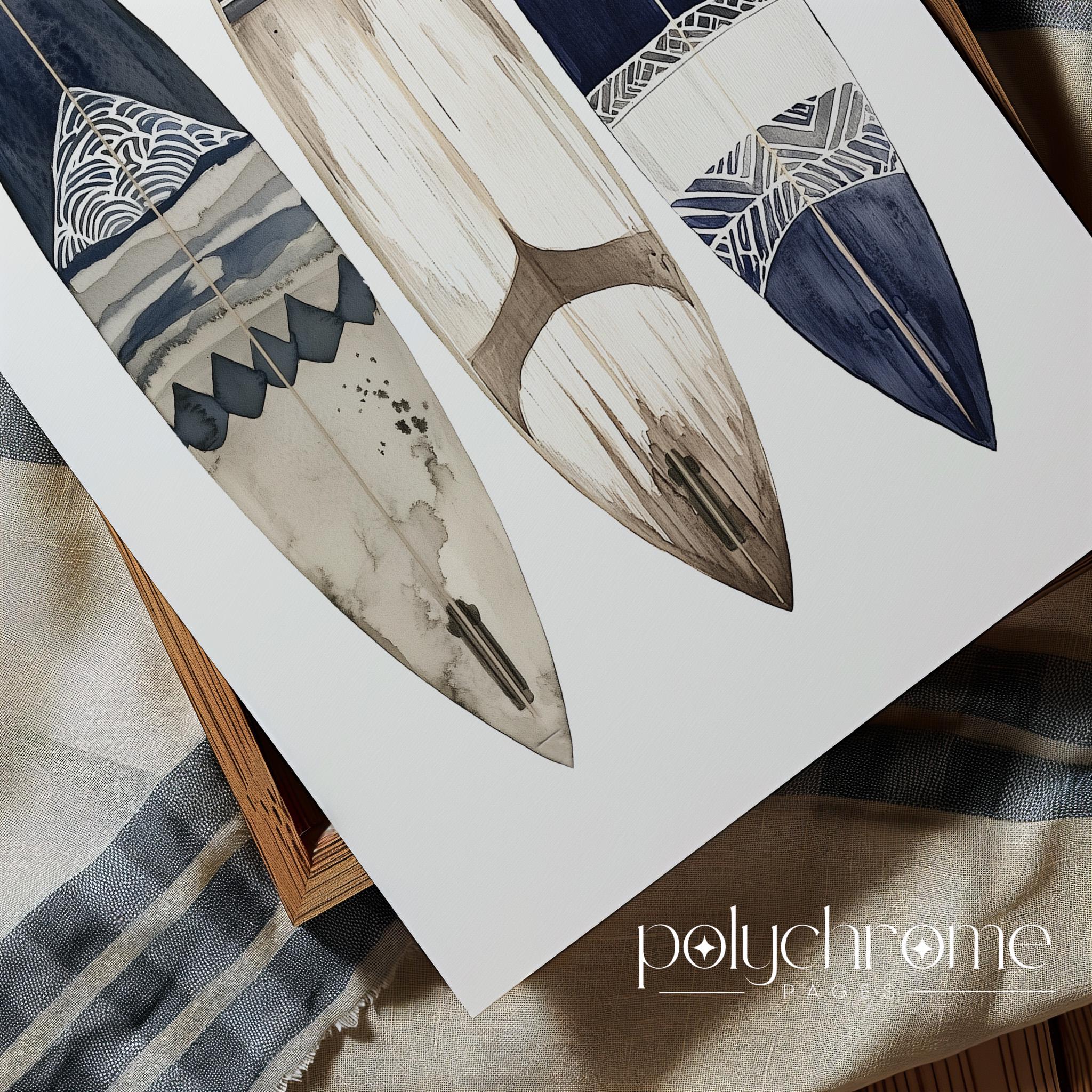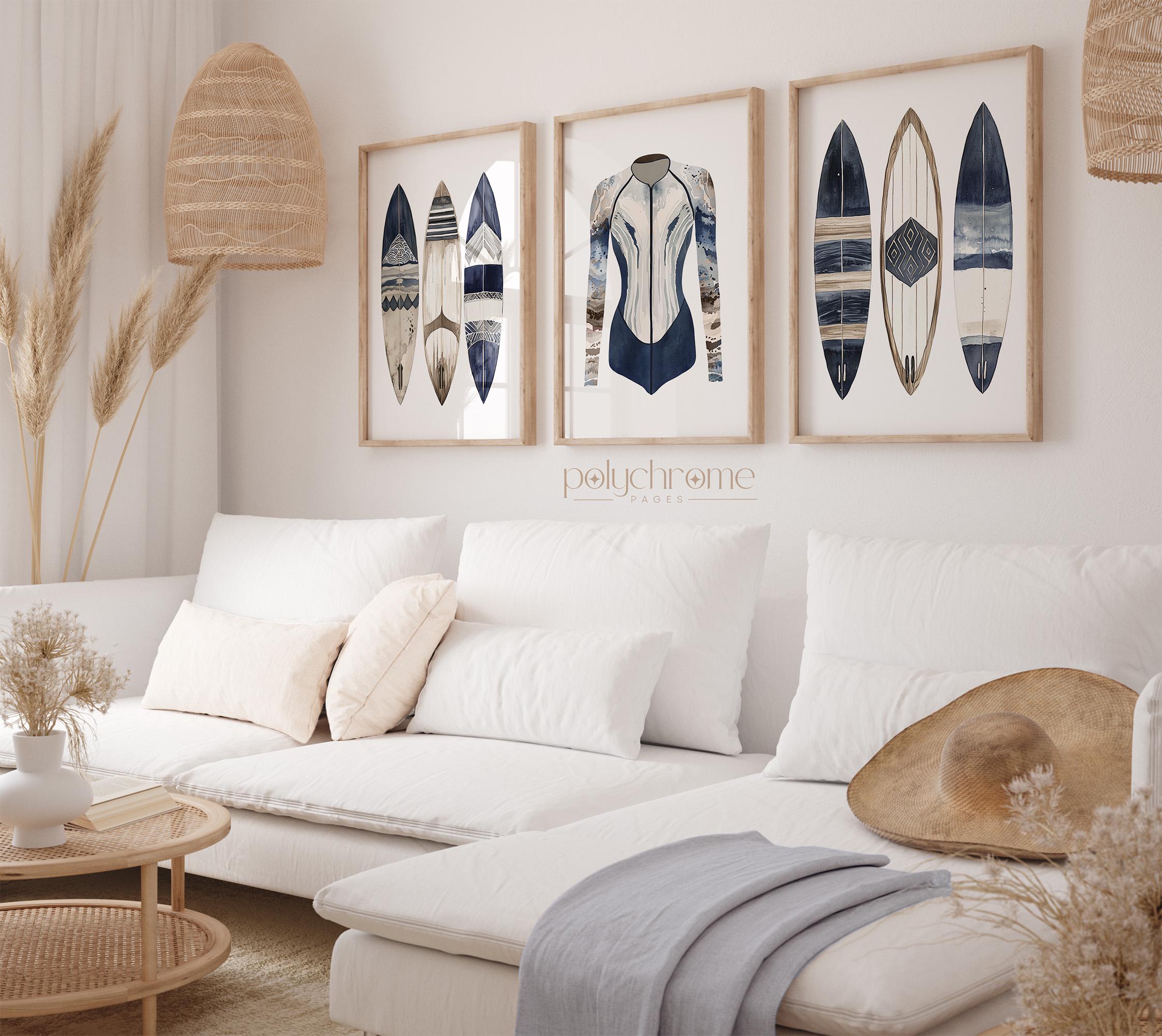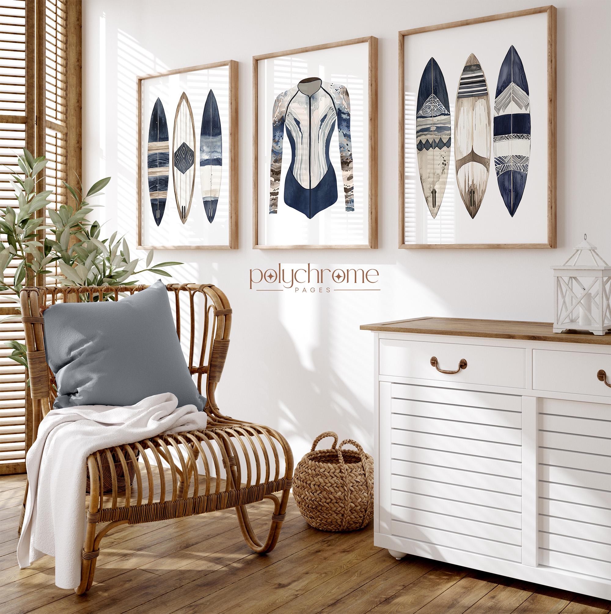 These navy blue and brown watercolor artworks of stand-up paddleboards, surfboards, and a wetsuit—captures the laid-back energy of days spent on the water. The earthy tones and coastal subject matter make them a natural fit for beach house bathrooms, lake house mudrooms, or any space with a Cape Cod feel. A great choice for surfers, paddleboarders, or anyone who loves that relaxed harbor town aesthetic.