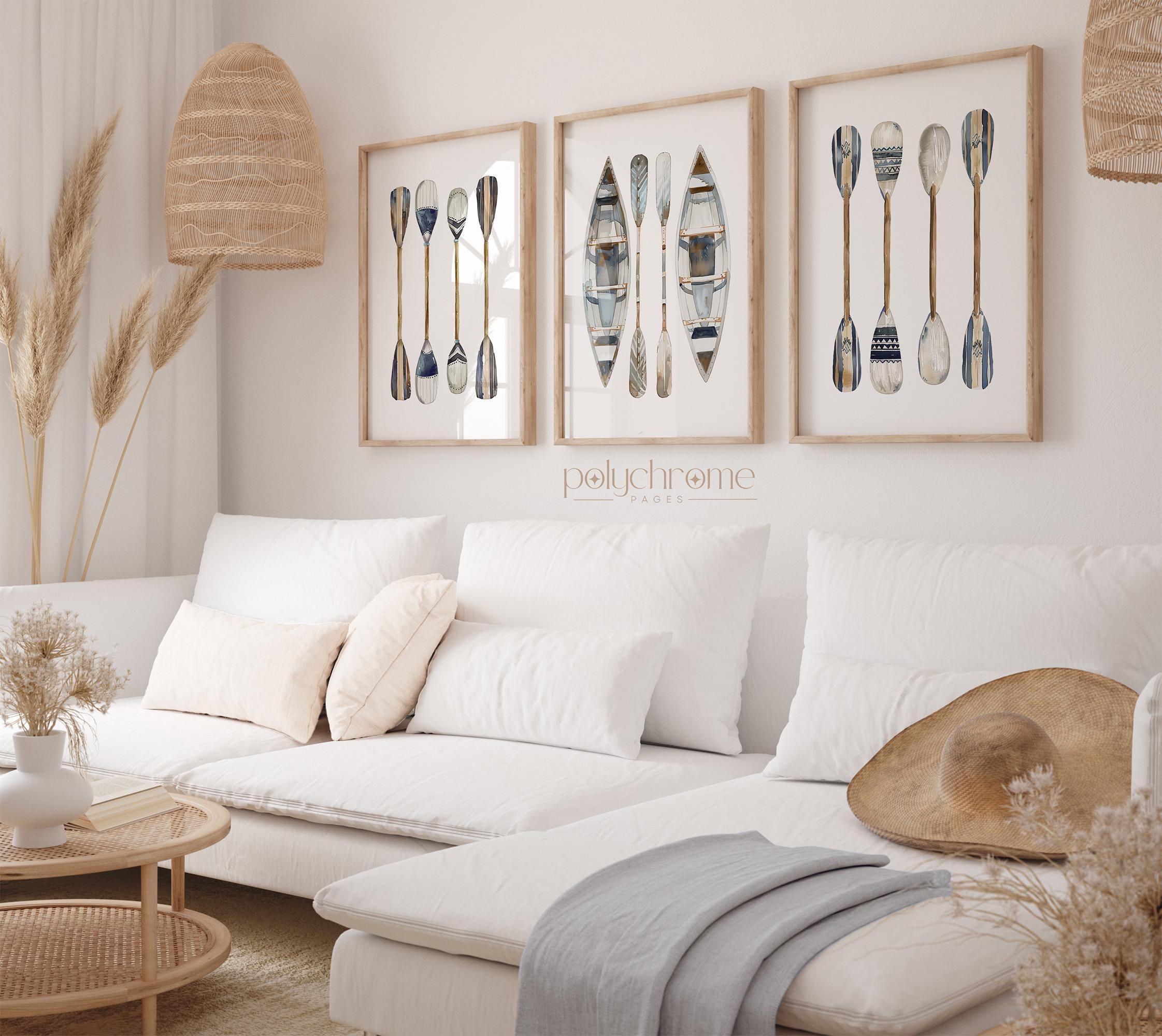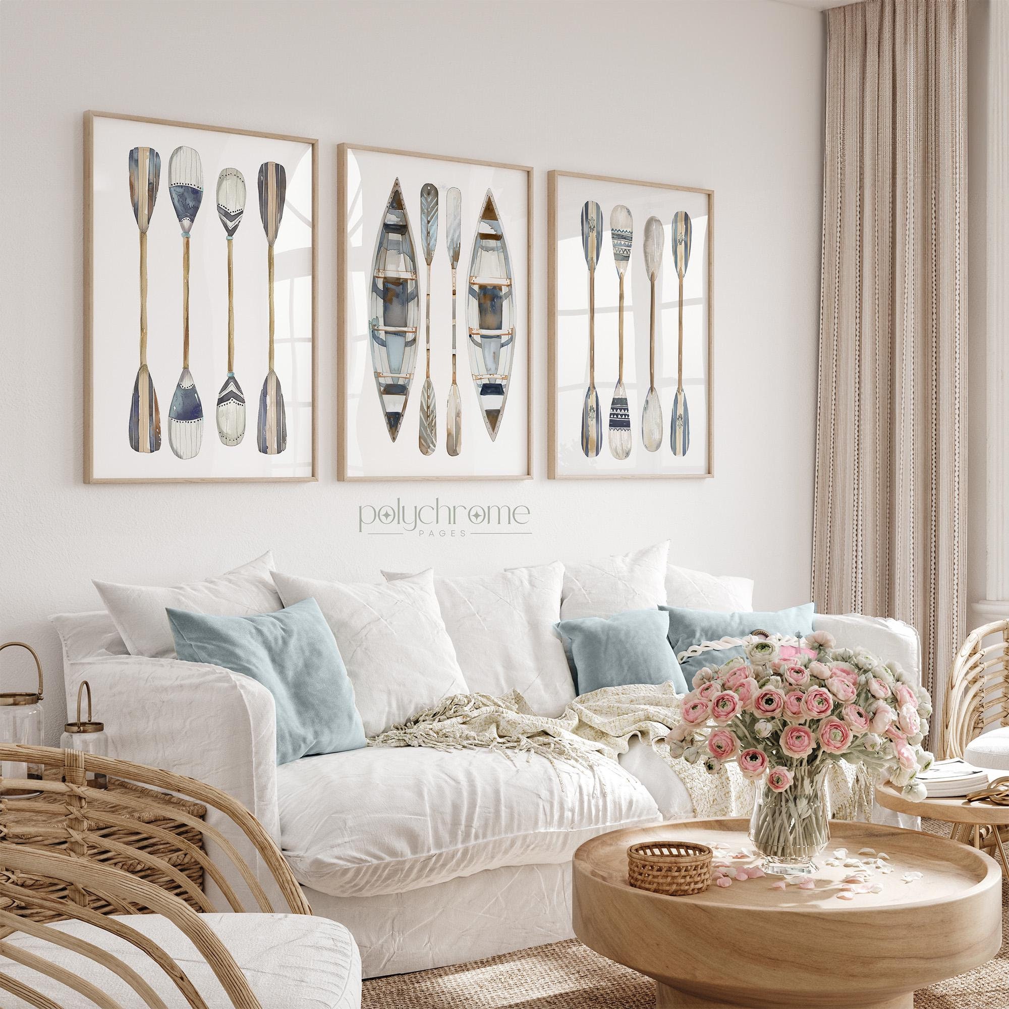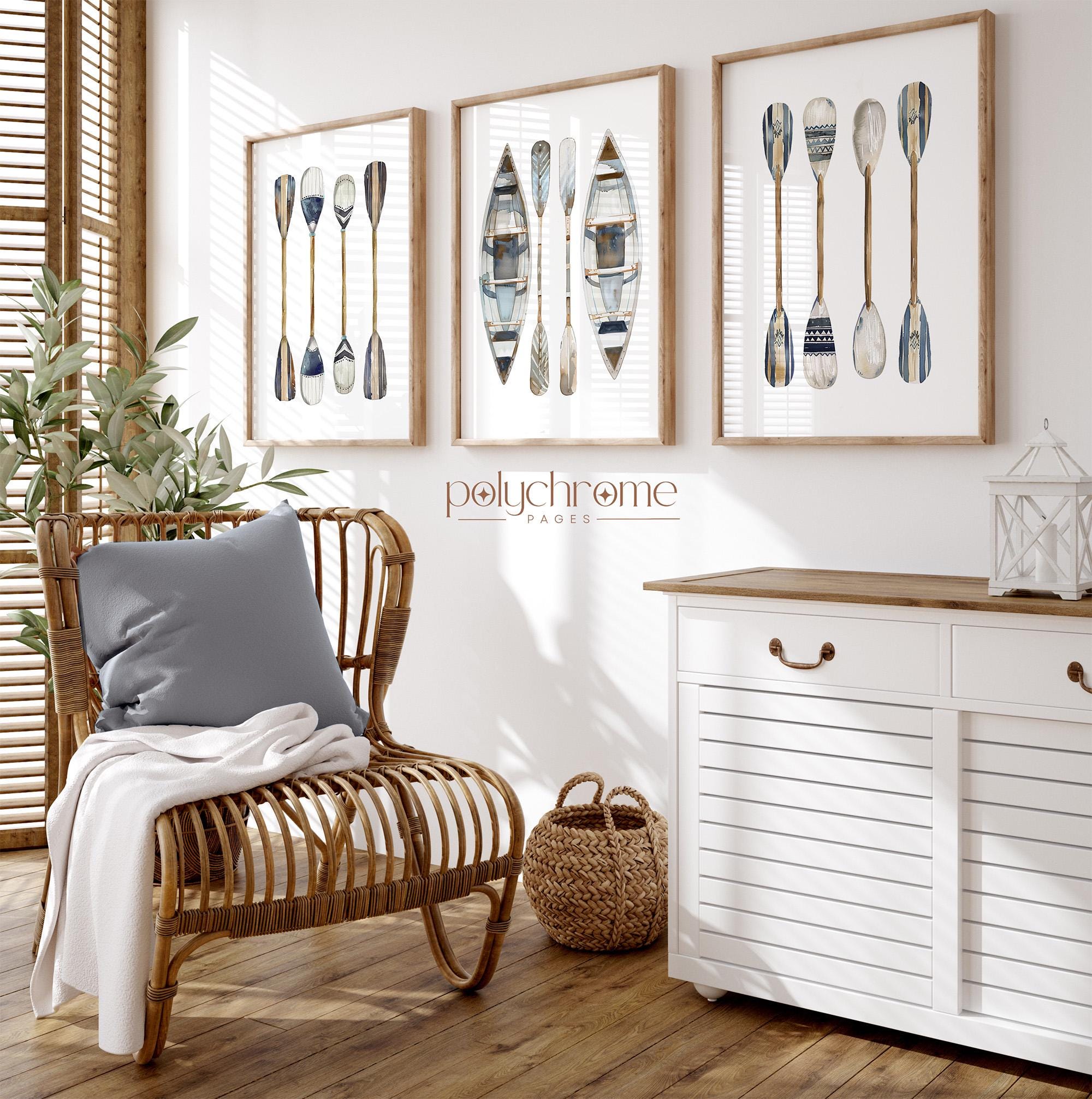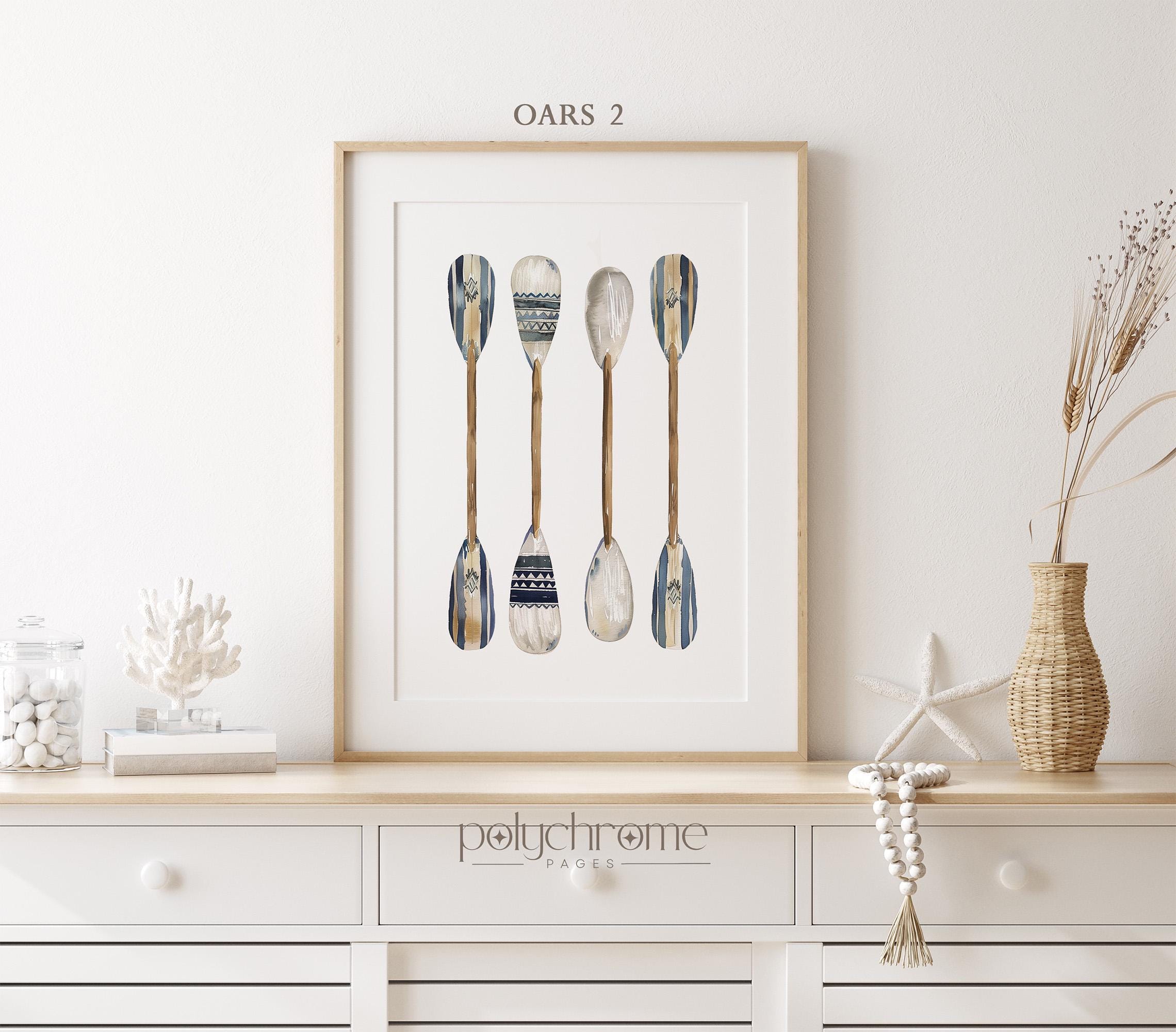 This set of nautical artworks of vintage oars and kayaks painted in rich navy blue and warm brown tones gives a timeless, slightly weathered feel that works beautifully in lake houses, beach cottages, or coastal-inspired bathrooms. Ideal for anyone who loves boating, sailing, or harbor life and wants to bring that relaxed waterfront atmosphere indoors.