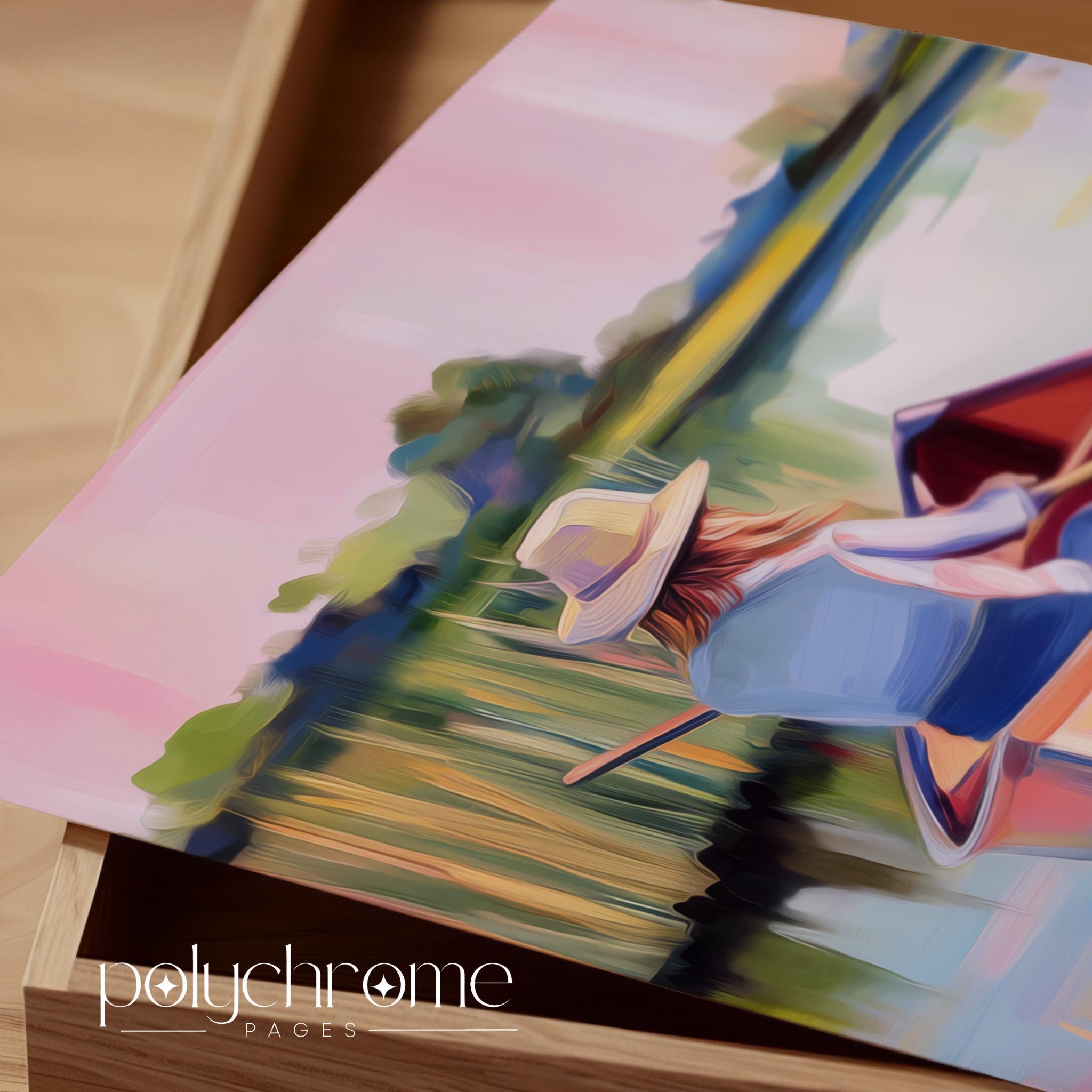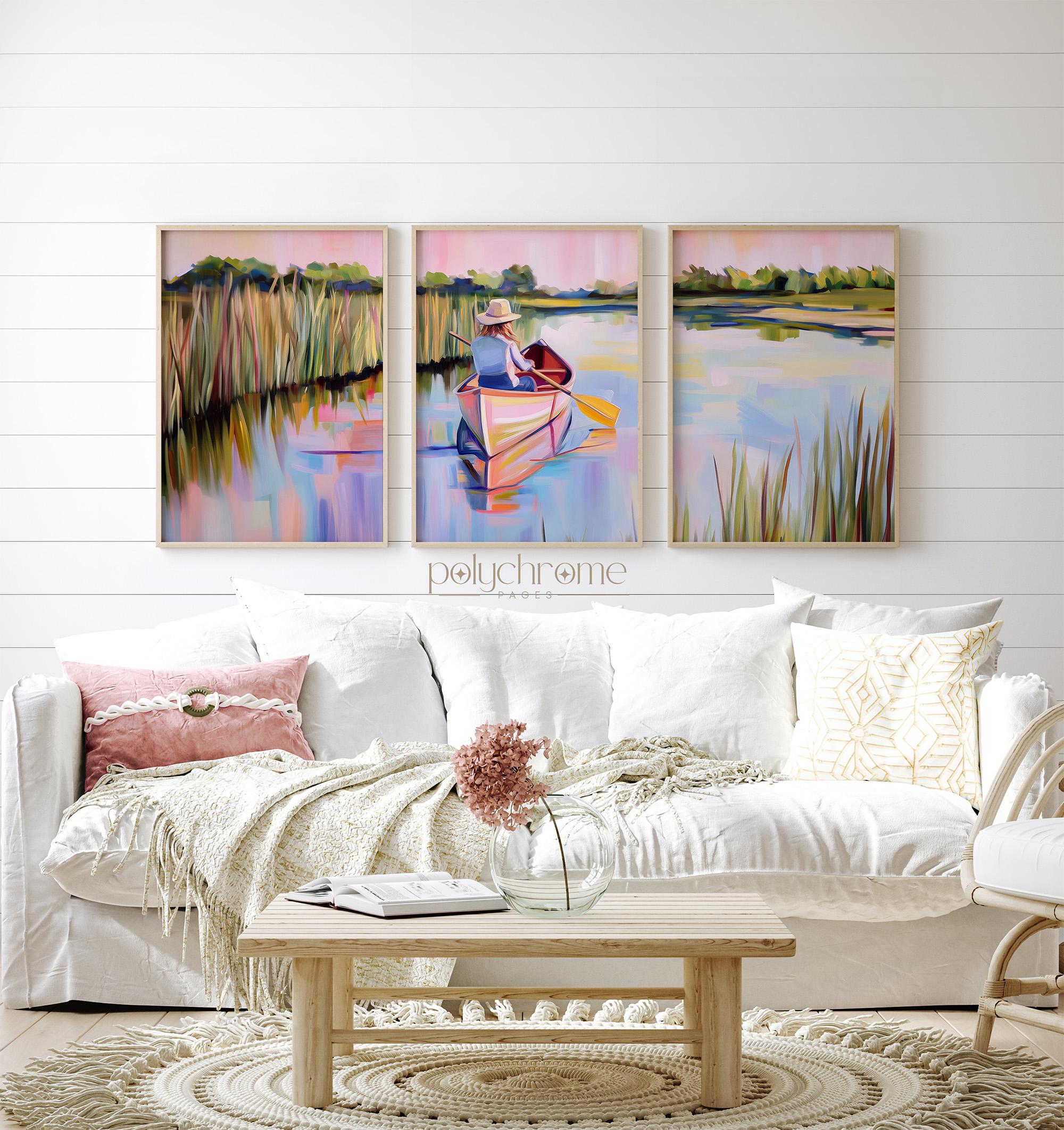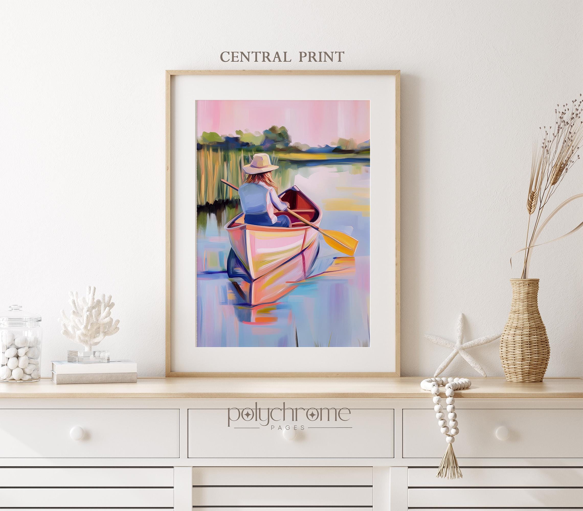 A serene scene of a woman relaxing in a small boat on a calm lake, painted in soft pastel pinks and blues that create a dreamy, peaceful atmosphere. This gentle landscape works beautifully in bedrooms, reading nooks, or lake house living spaces. Ideal for anyone who loves quiet waterside moments or vintage-inspired pastoral scenes.