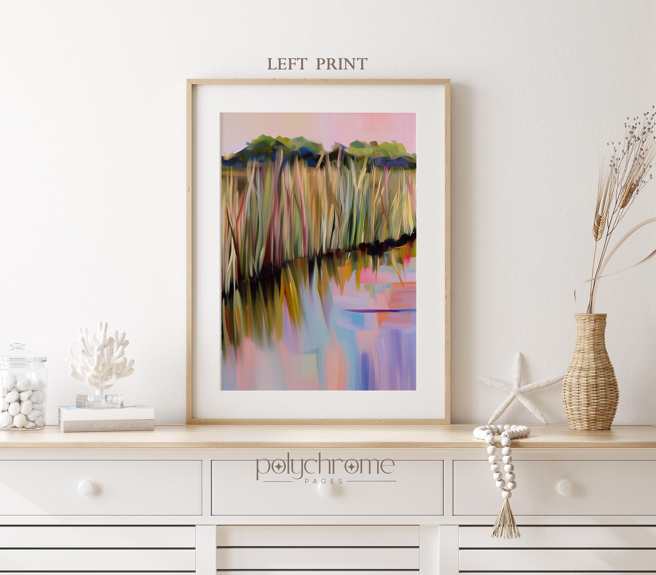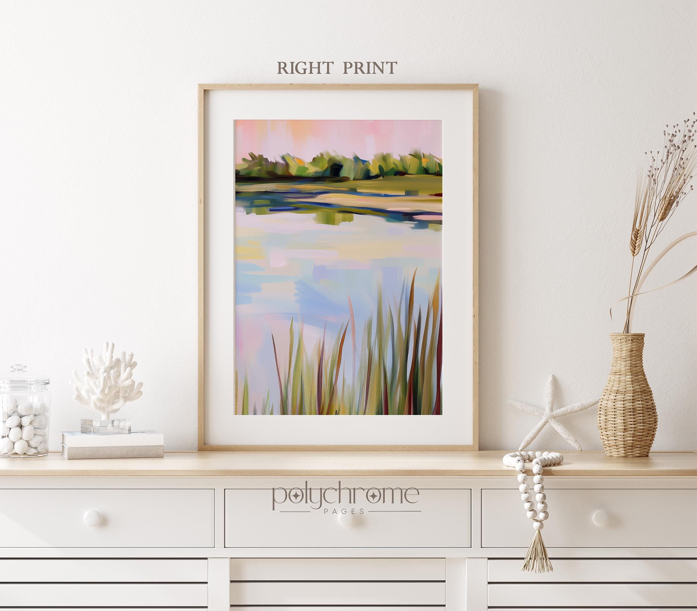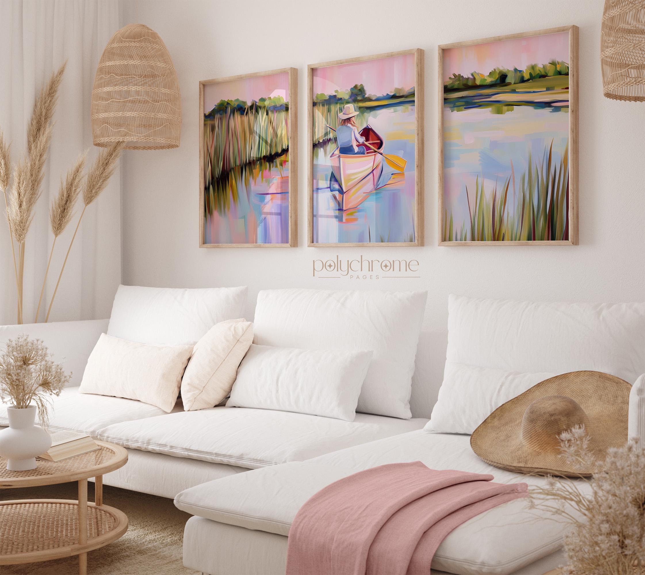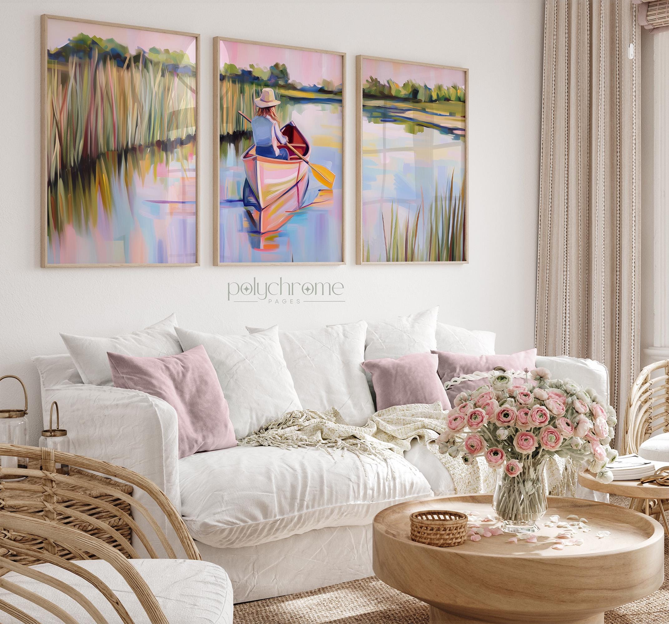 A serene scene of a woman relaxing in a small boat on a calm lake, painted in soft pastel pinks and blues that create a dreamy, peaceful atmosphere. This gentle landscape works beautifully in bedrooms, reading nooks, or lake house living spaces. Ideal for anyone who loves quiet waterside moments or vintage-inspired pastoral scenes.