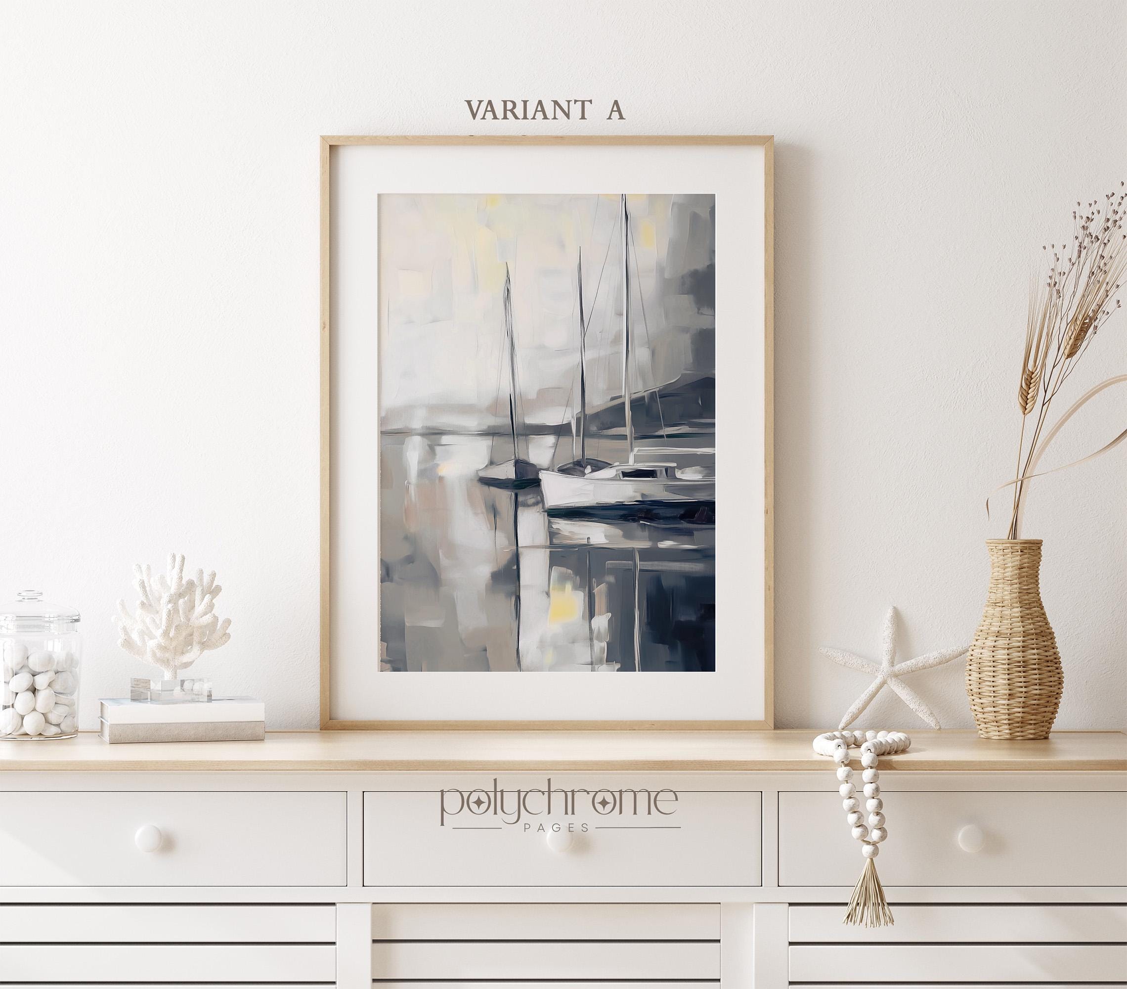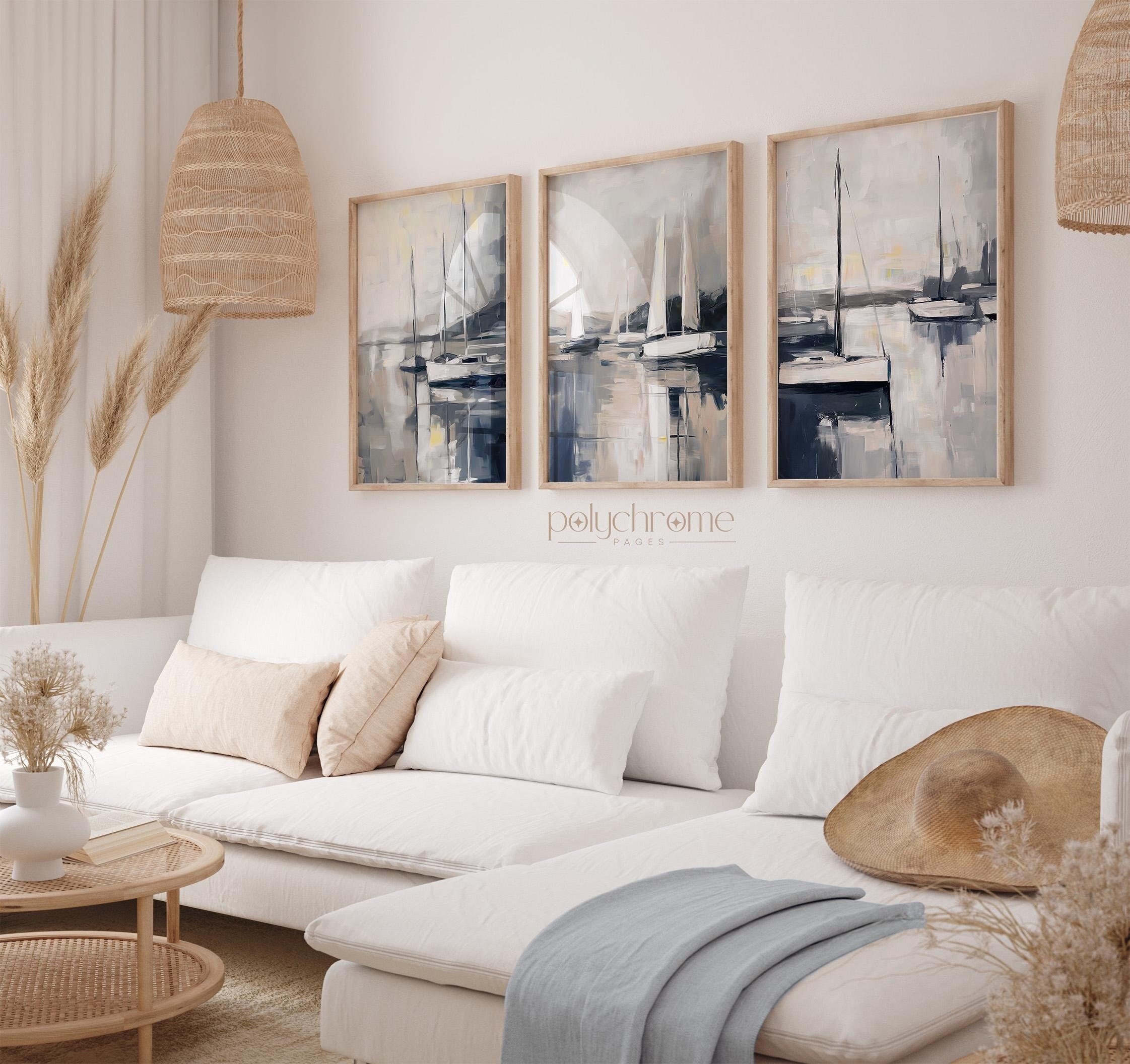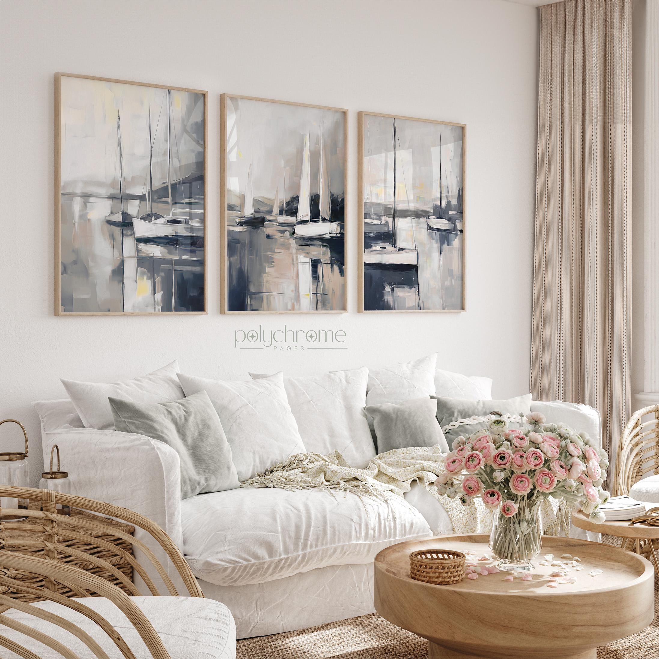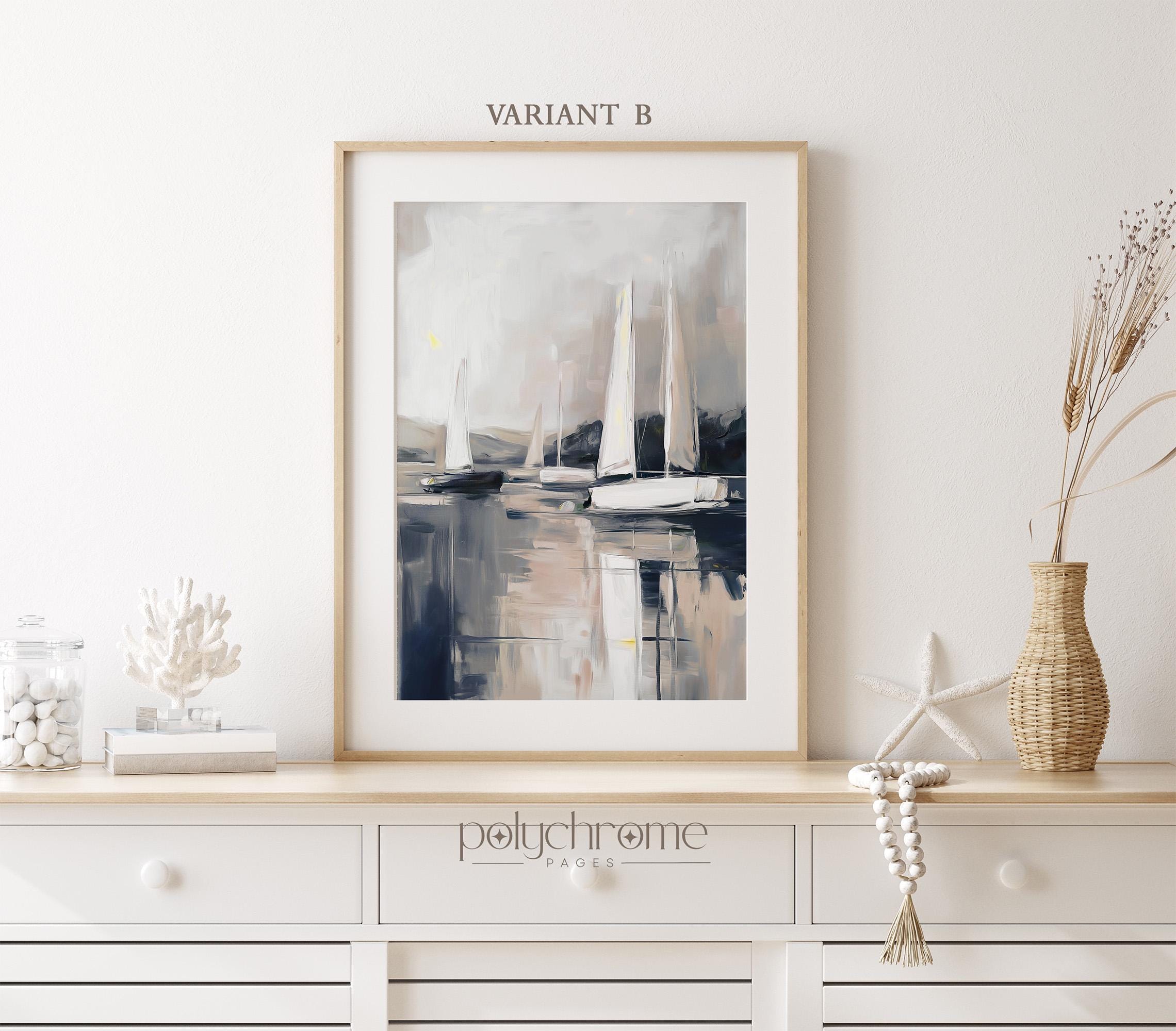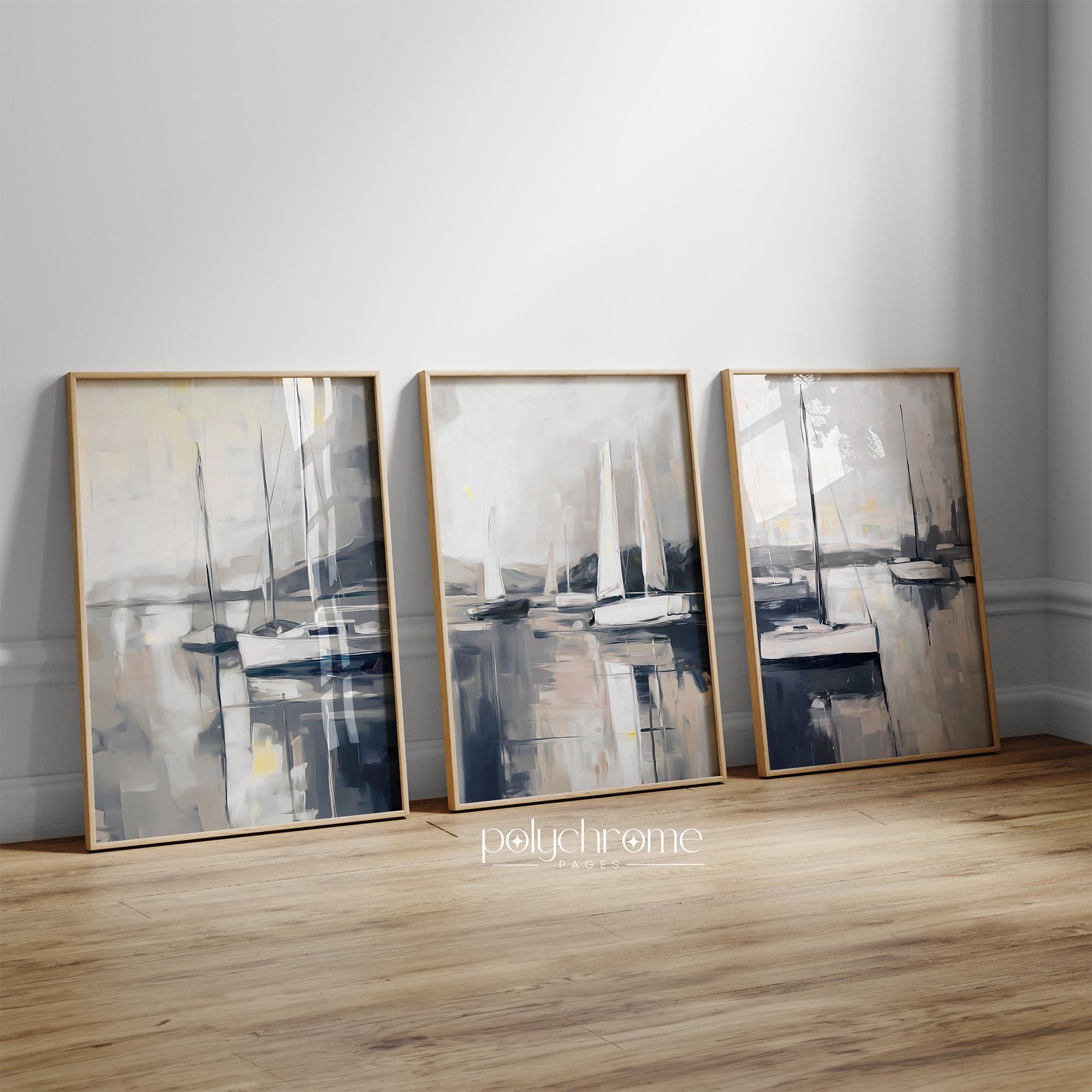 A serene navy blue seascape featuring sailboats and yachts drifting across calm harbor waters. The deep ocean tones and soft, almost abstract quality give this piece a tranquil, sophisticated feel. Works beautifully in lake house living rooms, fishing cabin dens, or coastal-inspired bathrooms. A nice choice for anyone who loves nautical themes or wants to bring that relaxed Hamptons marina atmosphere indoors.